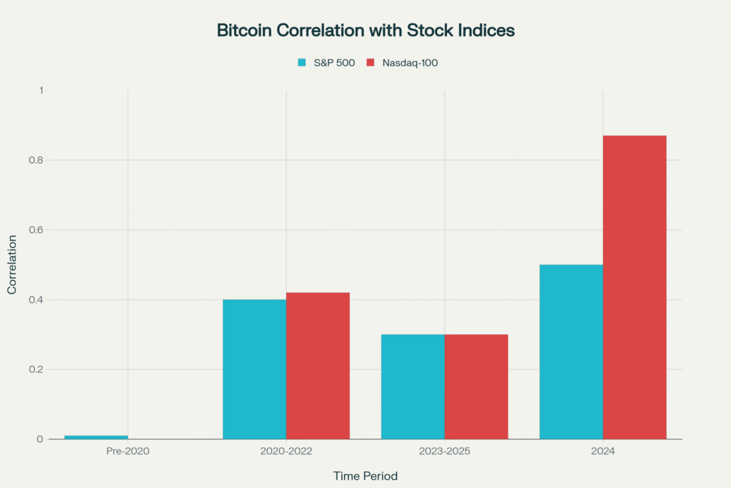 The relationship between Bitcoin and equity markets has fundamentally transformed since 2020. Research reveals that Bitcoin’s correlation with major equity indices has risen dramatically over the past five years. Before Bitcoin ETFs were introduced, correlations were essentially zero or even negative—Bitcoin truly functioned as digital gold with portfolio diversification benefits. However, post-2020, Bitcoin-to-S&P 500 correlation rose to 0.40 in 2022, and Bitcoin-to-Nasdaq correlation spiked to 0.87 in 2024 following MicroStrategy’s inclusion in the Nasdaq-100.