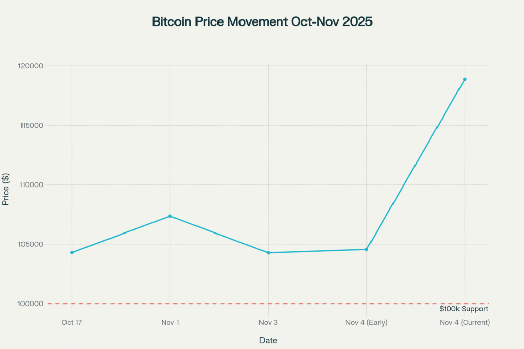 Bitcoin is currently trading near $118,885, but this figure masks the underlying fragility of the cryptocurrency’s position. The asset opened November following the worst October performance in a decade, with a 3.69% monthly loss that broke a remarkable seven-year “Uptober” streak. More concerning, Bitcoin had been trading as low as $104,288 on November 3, representing a retreat from its 2025 all-time high of $122,979 reached on July 14.