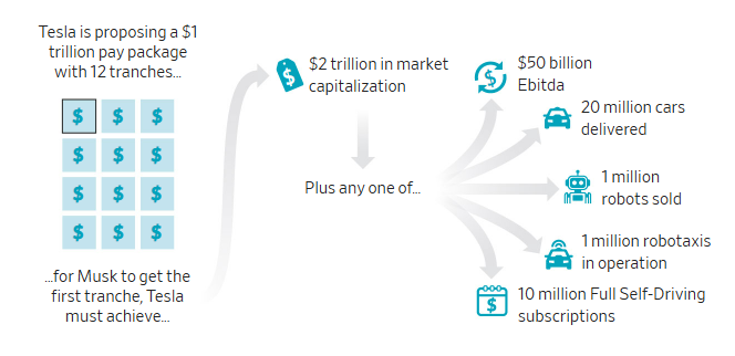 Tesla’s new compensation structure ties Musk’s potential payout to a series of aggressive milestones. According to filings:
